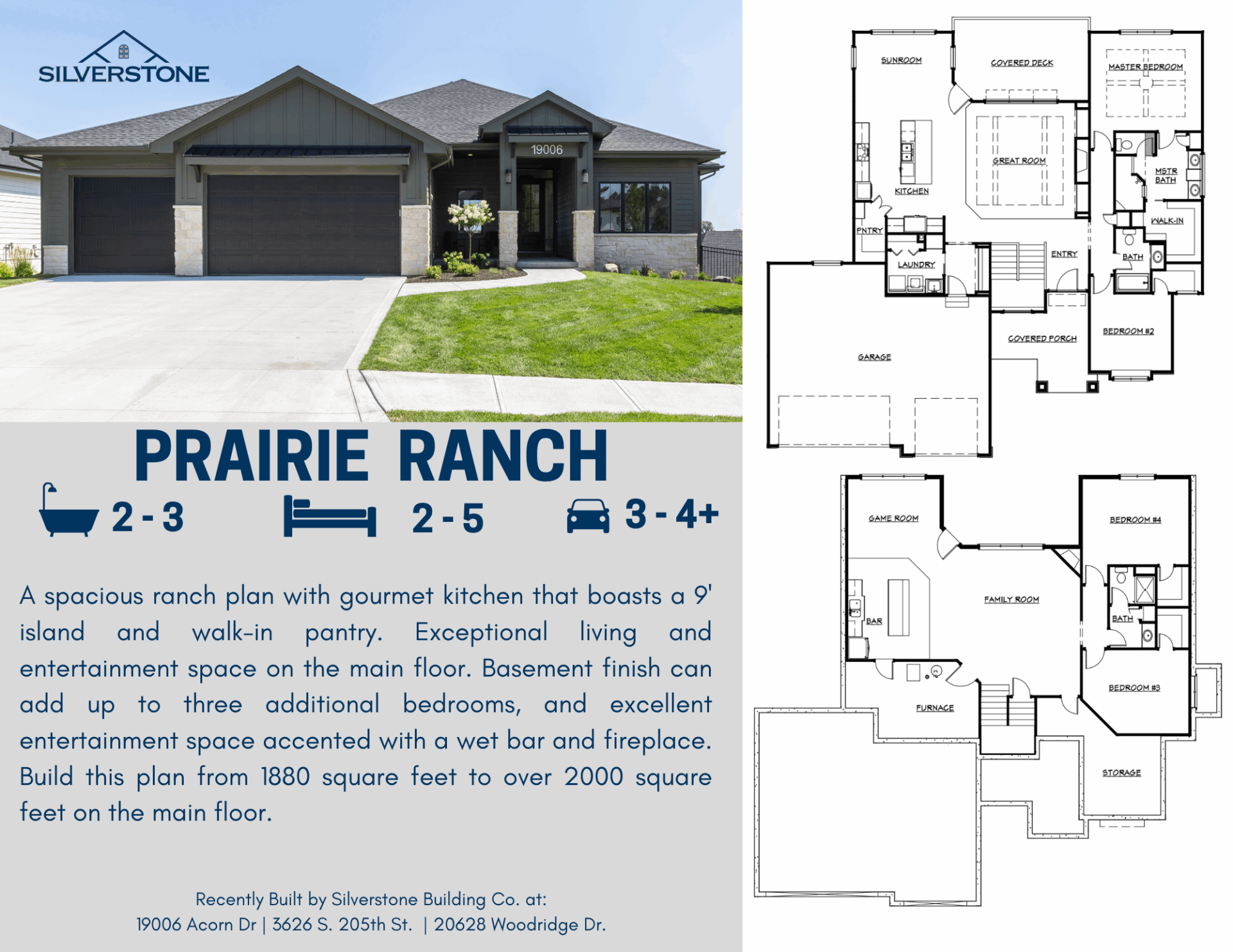 Reach out to Ben at 402-965-1848 to discuss floor plan and additional options. A spacious ranch plan with a gourmet kitchen that boasts a 9′ island and walk-in pantry. The Prairie Ranch is feature rich showcasing built-in cabinetry, large pantry space with optional appliance station, vaulted ceiling and more. Exceptional living and entertainment space on the main floor. Basement finish can add up to three additional bedrooms, and excellent entertainment space accented with a wet bar and fireplace. Build this plan from 1750 square feet to over 2000 square feet on the main floor.