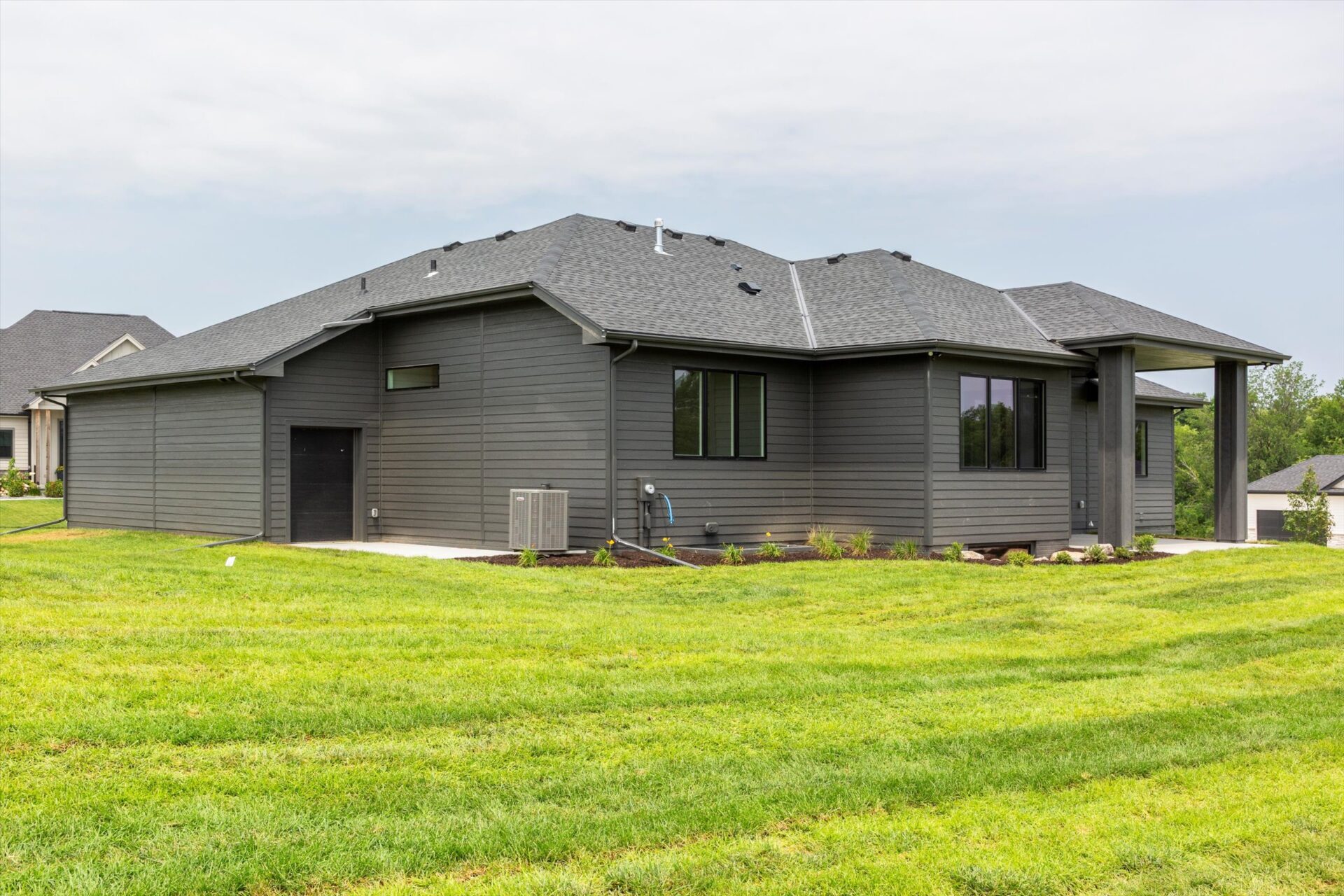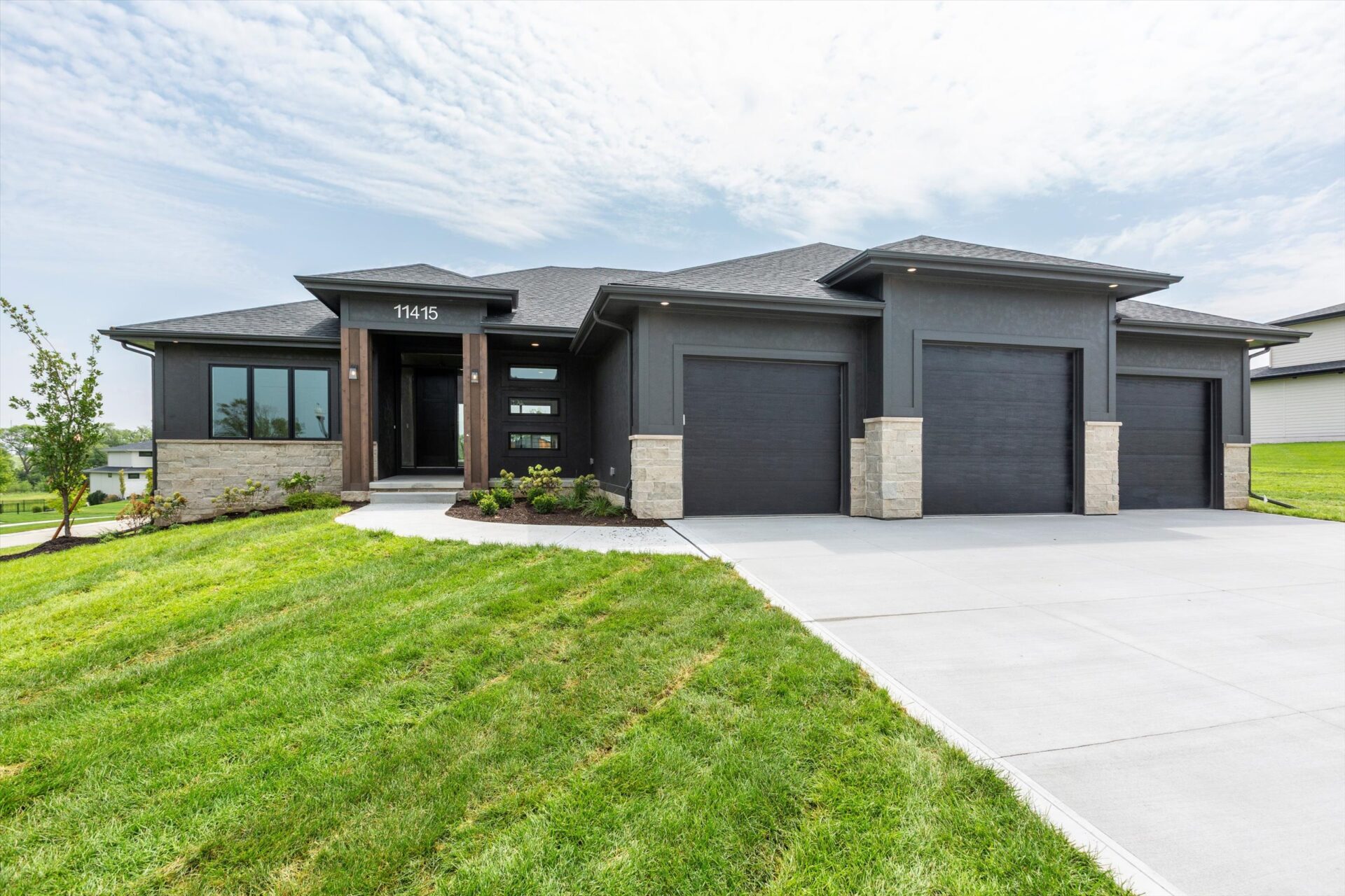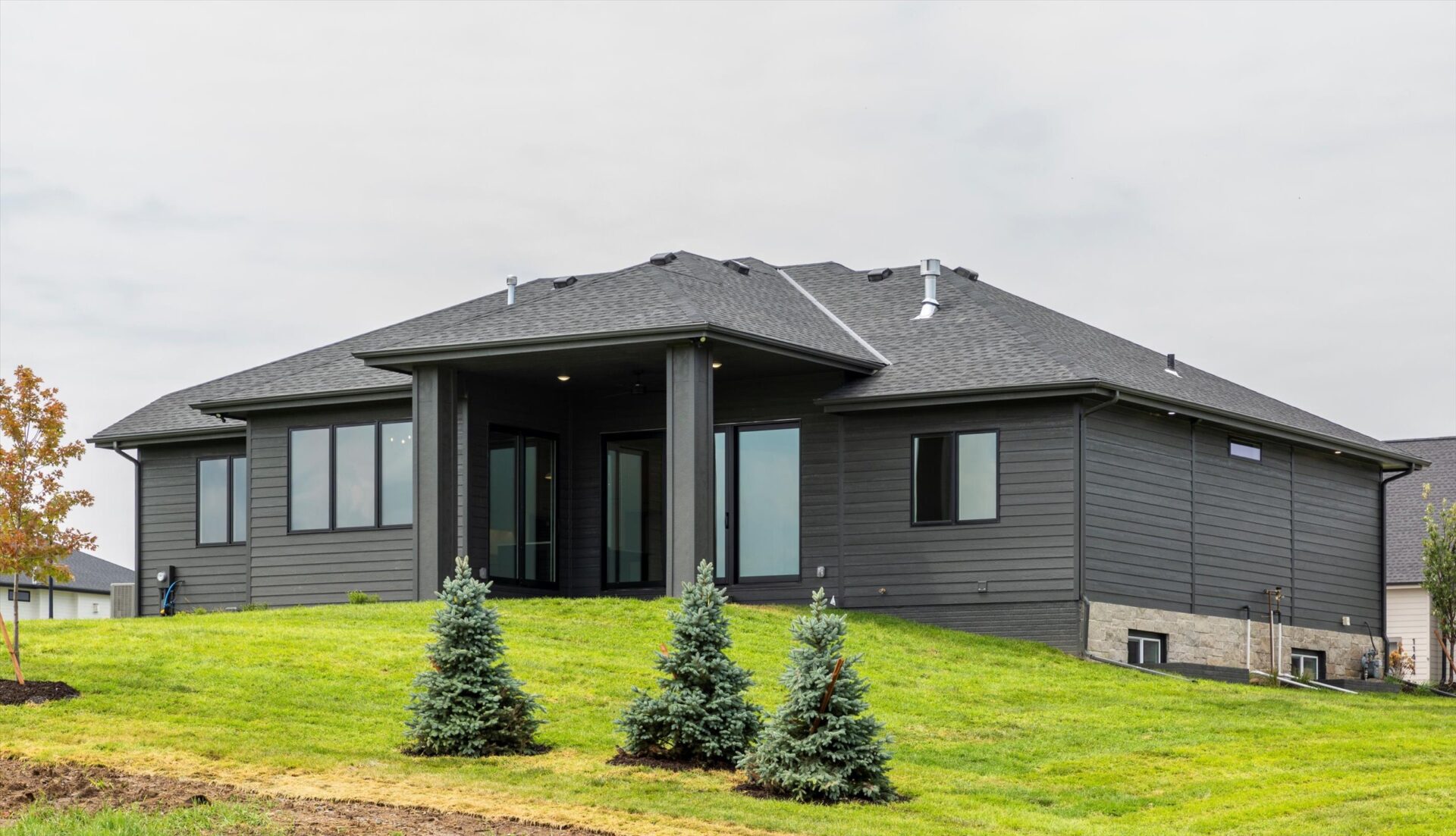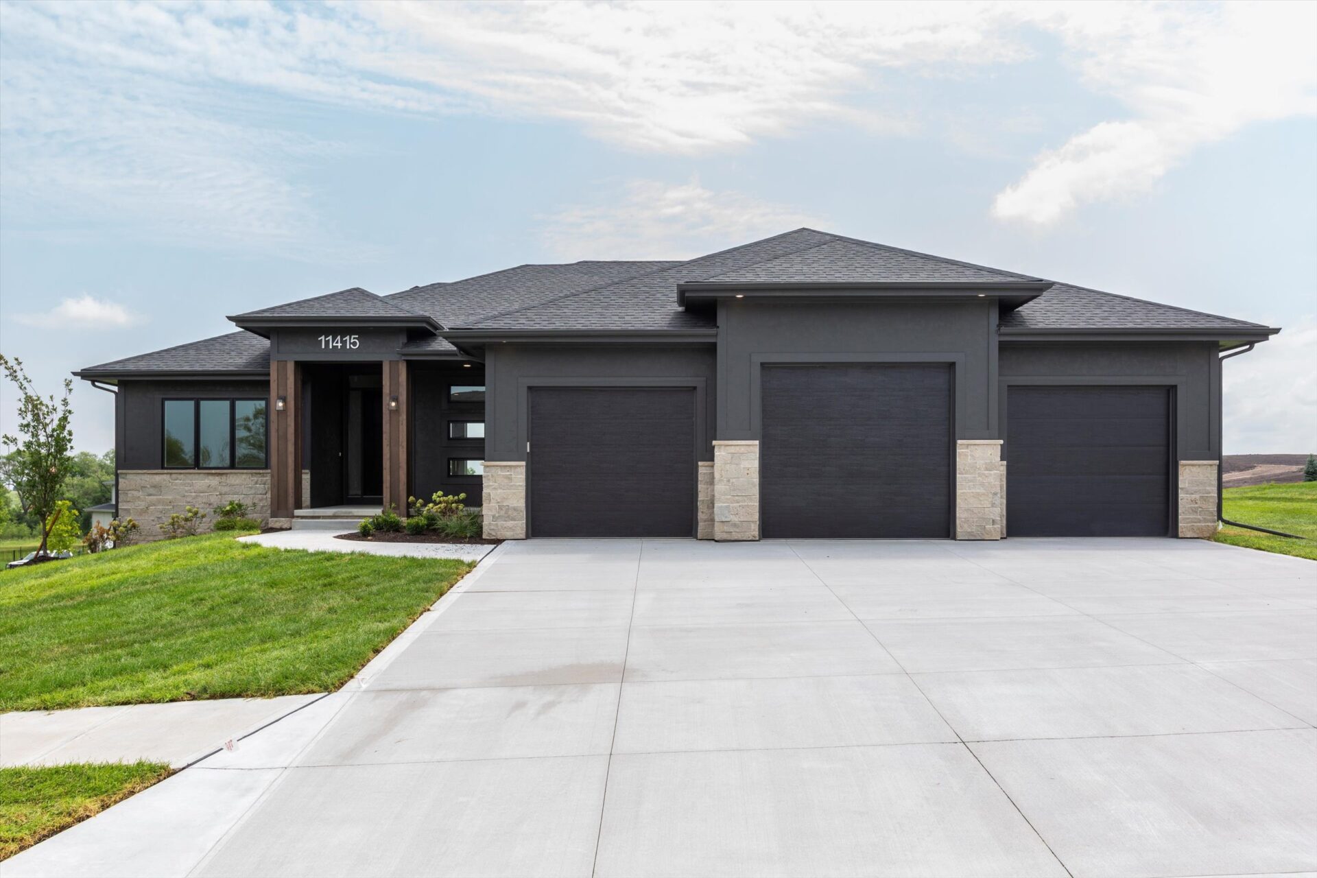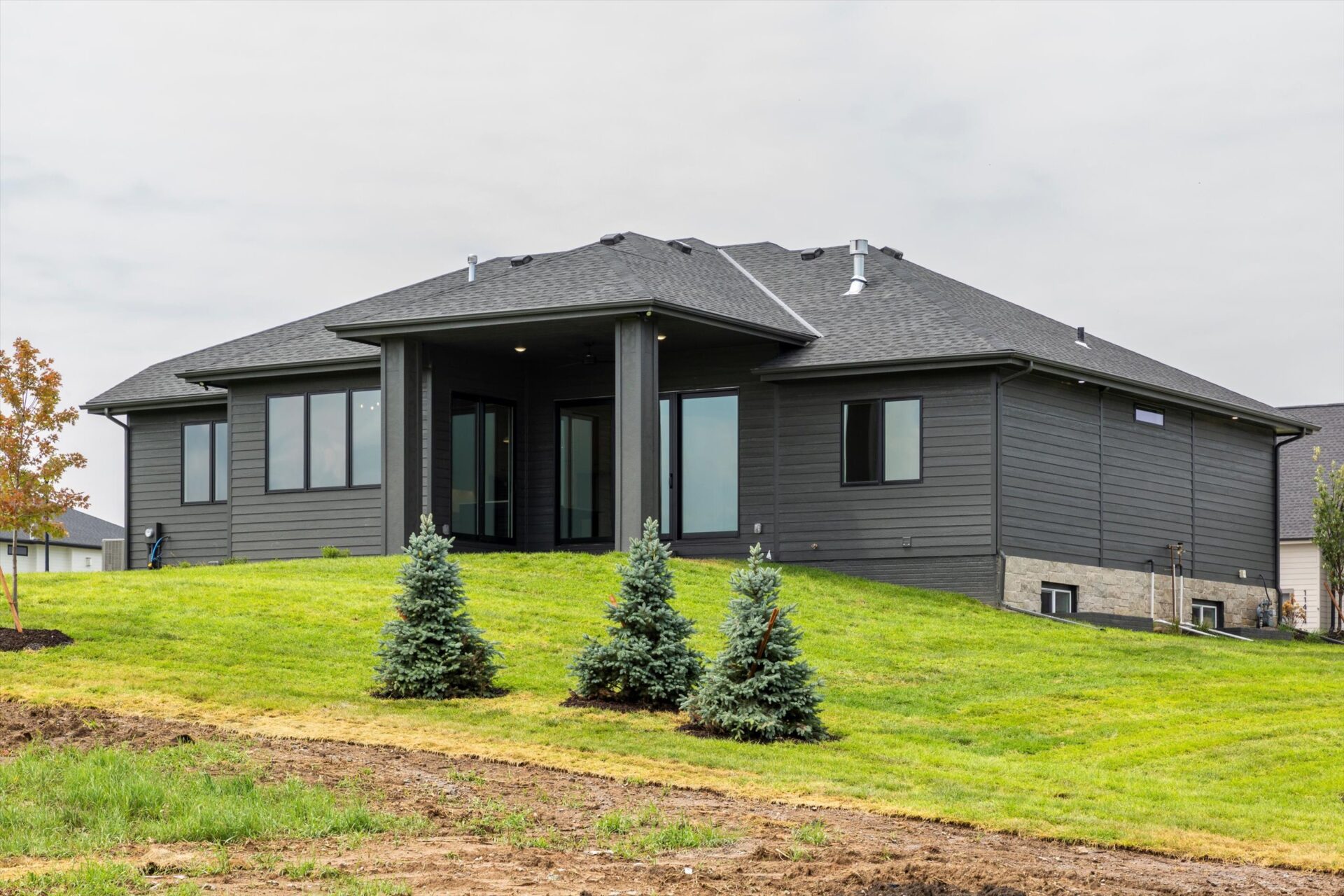 Custom built Split-Three Rambler in Gretna’s Hidden Hollow Estates. Built on a large west facing flat lot. Expanded plan includes a 3 bedroom basement finish and expanded garage with three door front. Exterior design is tailored to customer’s desires for a modern prairie style with steeper roof line and larger garage.