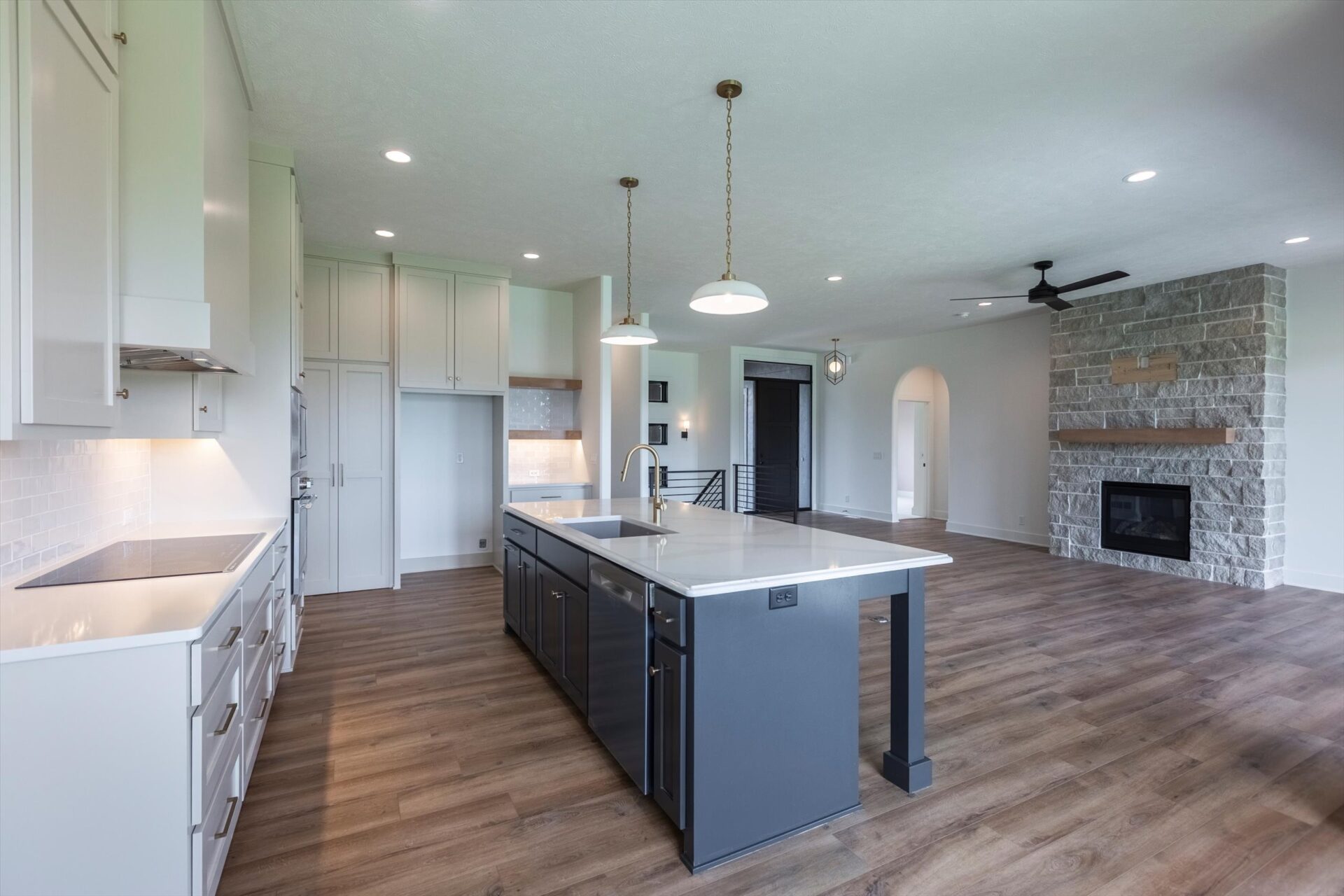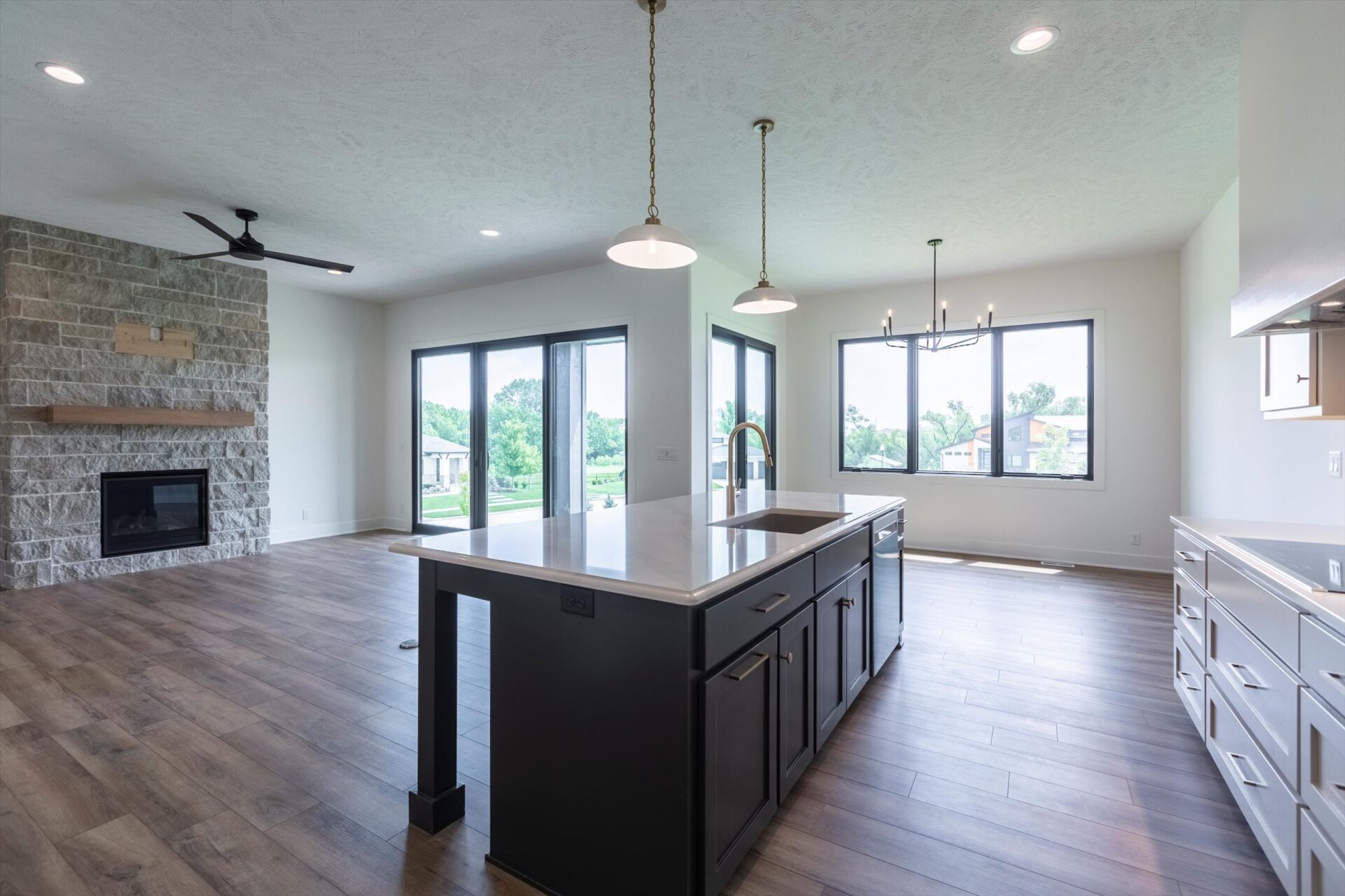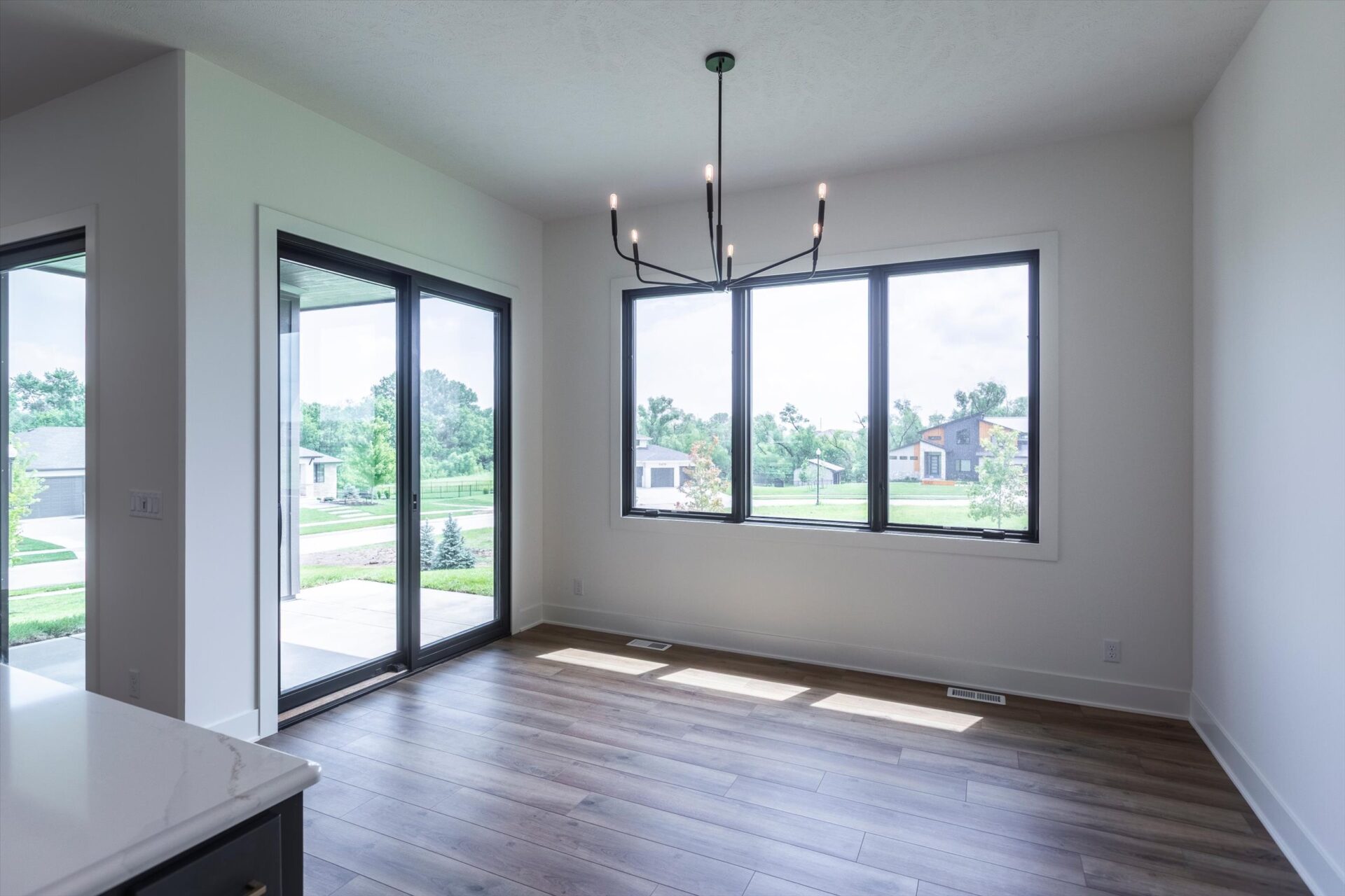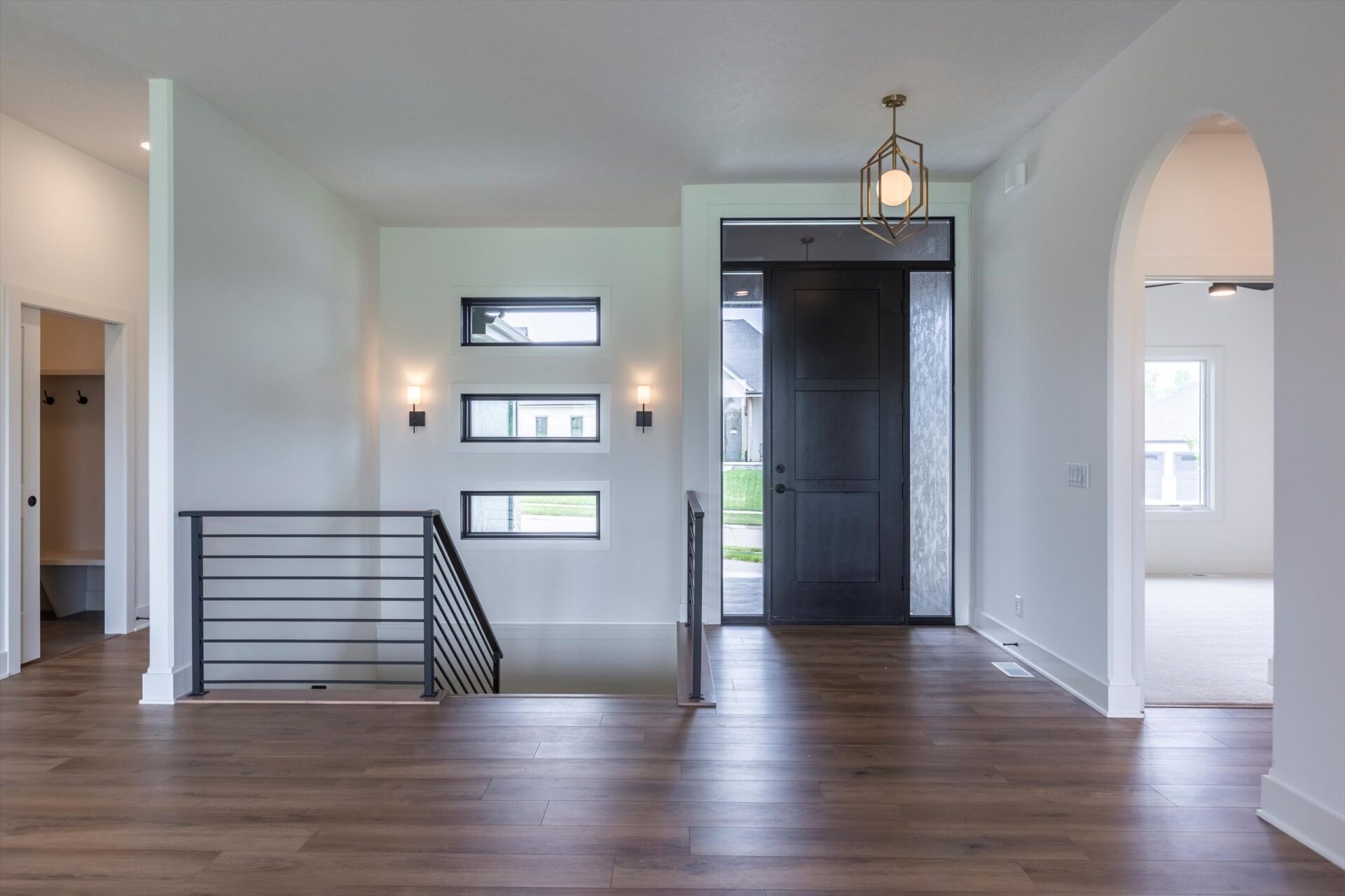 Custom built Split-Three Rambler in Gretna’s Hidden Hollow Estates. Built on a large west facing flat lot. Expanded plan includes a 3 bedroom basement finish and expanded garage with three door front. Exterior design is tailored to customer’s desires for a modern prairie style with steeper roof line and larger garage.