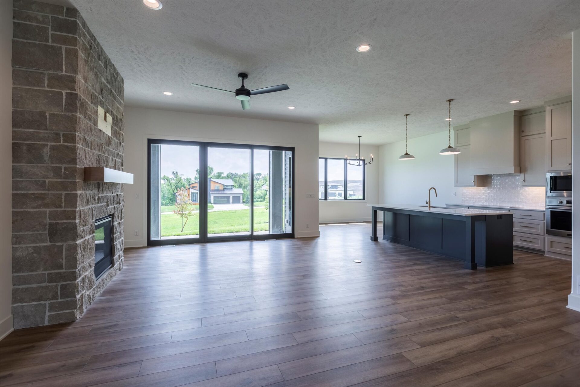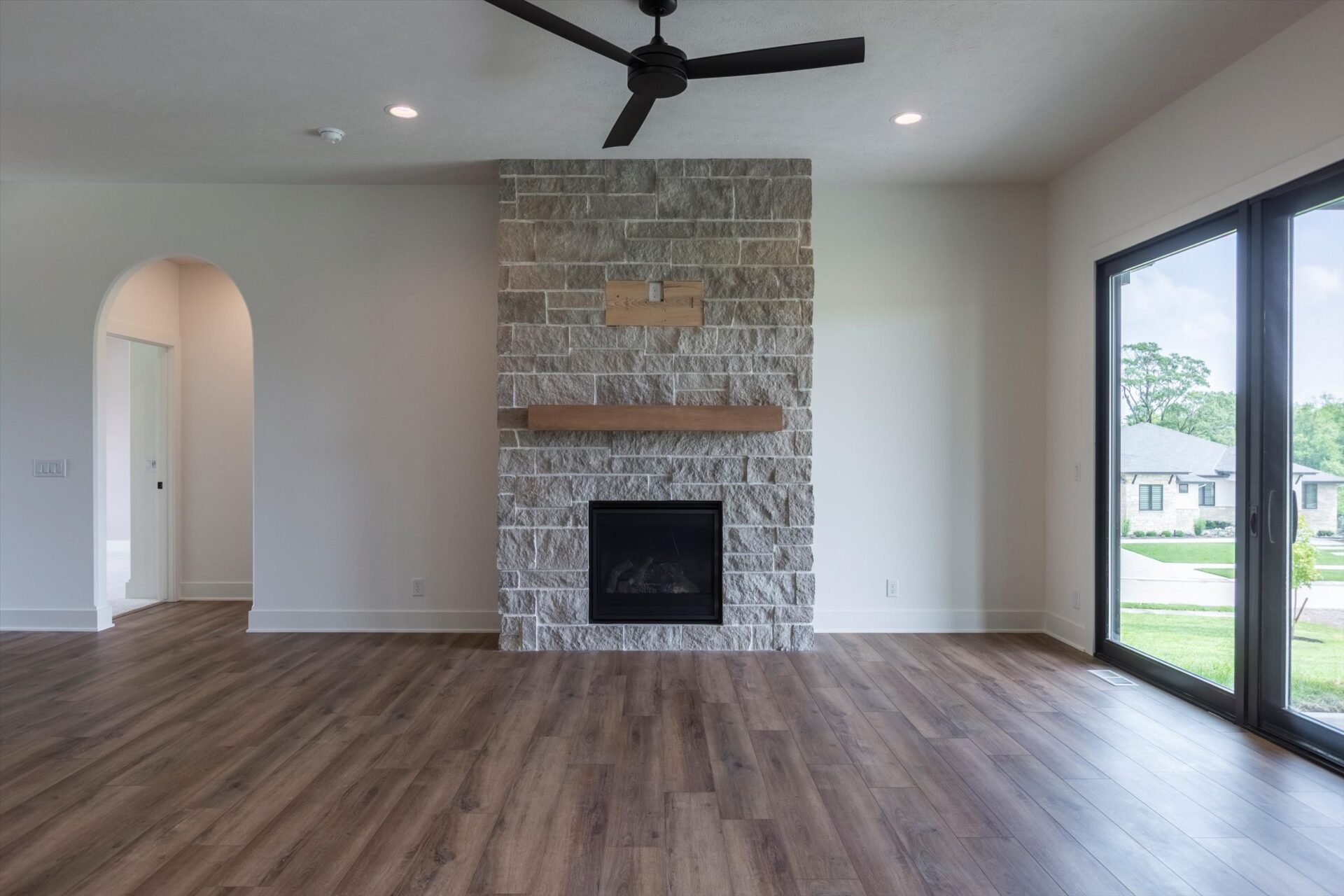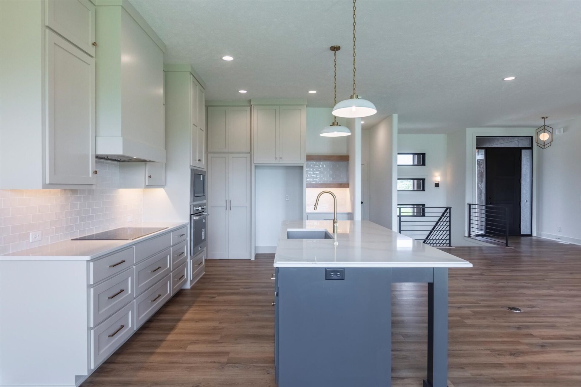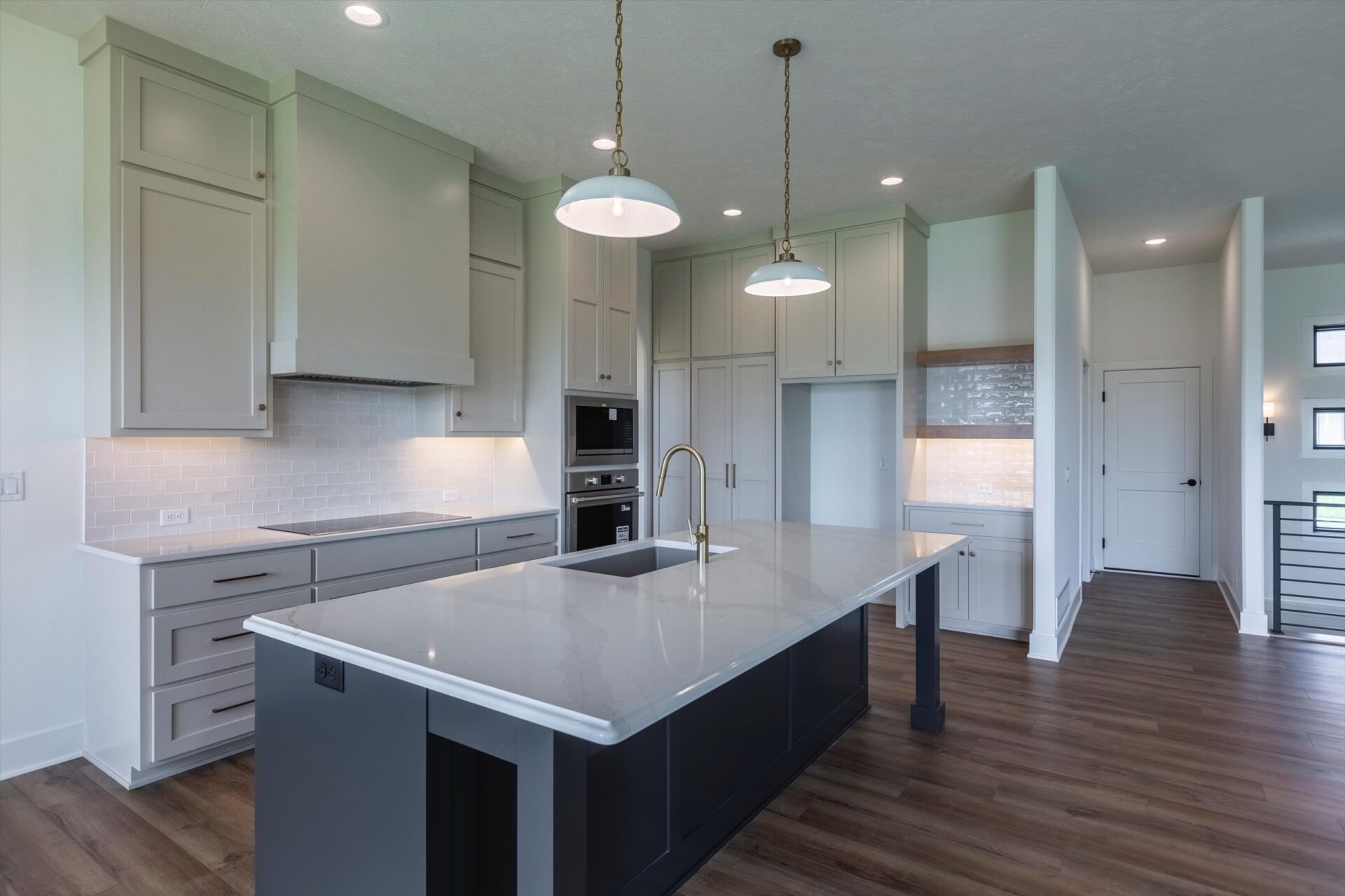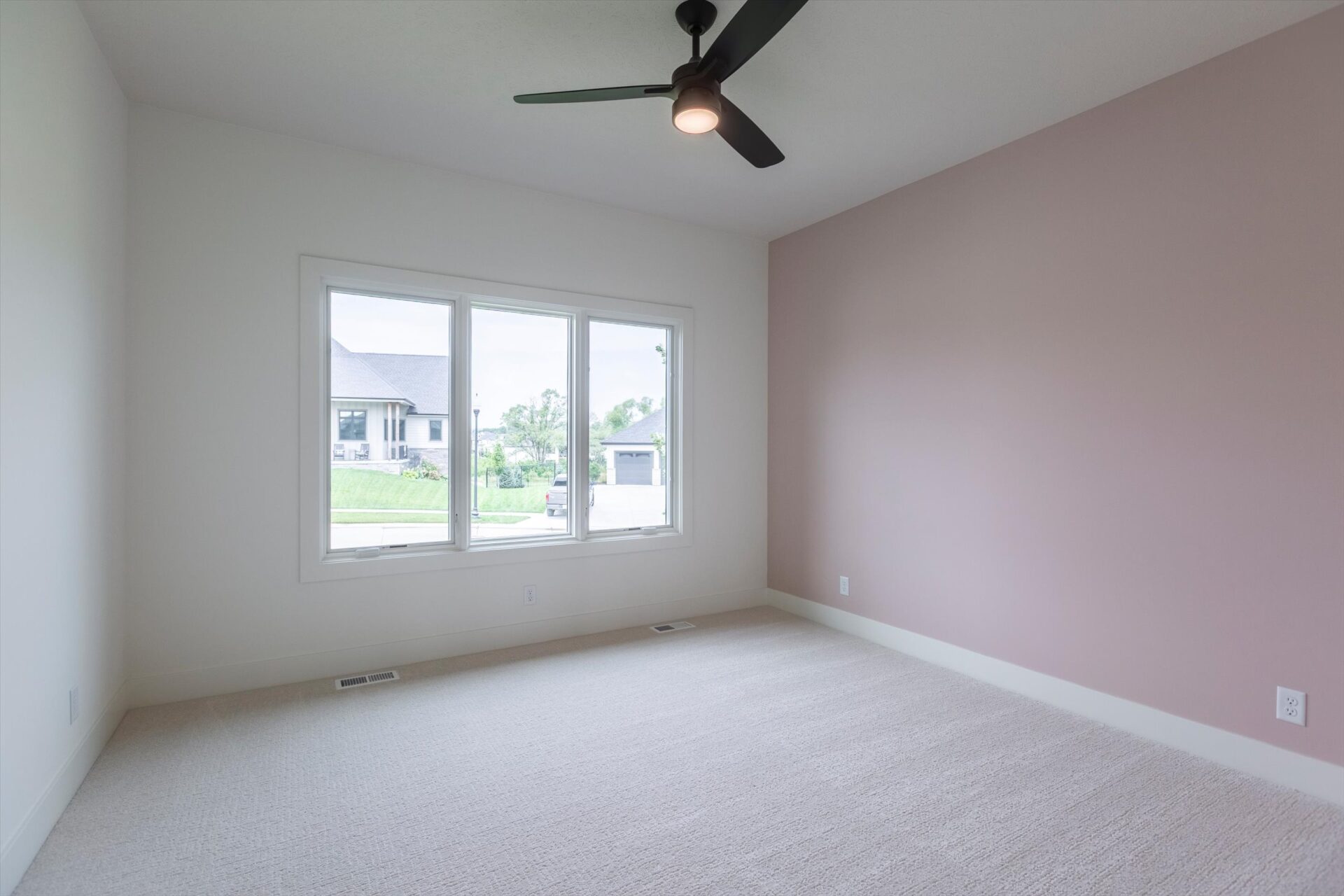 Custom built Split-Three Rambler in Gretna’s Hidden Hollow Estates. Built on a large west facing flat lot. Expanded plan includes a 3 bedroom basement finish and expanded garage with three door front. Exterior design is tailored to customer’s desires for a modern prairie style with steeper roof line and larger garage.